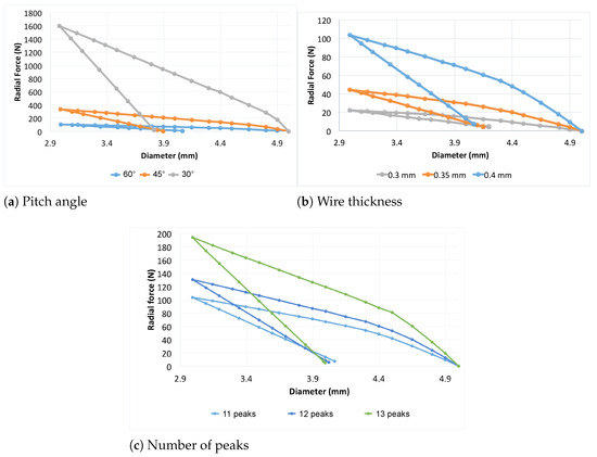 We considered three values for the wire thickness: , and mm. As mentioned earlier, the other two parameters were held constant to isolate the effects of changing the strut thickness. Using an example with fixed values for the number of peaks and pitch angle (11 and , respectively), Figure 6b illustrates the influence of the wire thickness. Increasing the thickness of the wire results in higher radial forces required to compress the stent to the desired diameter, as expected. Moreover, the increase in thickness also impacts radial recoil, as depicted in the Figure. Thicker wire stents tend toward a smaller diameter after freely expanding from the compressed state. Thus, an increase in strut thickness enhances radial force but leads to greater radial recoil. This is likely due to the reduced gap between the struts for higher thicknesses and early contact between them once the device is compressed. The maximum radial force is achieved at compression for the thicker stent ( N). The mm stent has a radial force of 44.58 N, while the mm stent has N. Thus, increasing the thickness from mm to mm and then to mm increases the radial force by and , respectively, while increasing from mm to mm increases the radial force by .