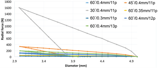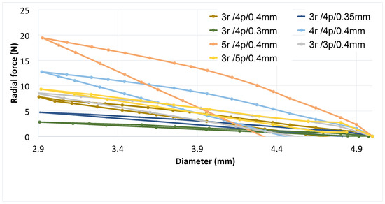 In Figure 7, the variations of the selected parameters outlined and illustrated above are grouped. For the sake of clarity, given the considerable variability in the force required to compress the prosthesis, as demonstrated in the preceding figures, only a selection of curves is included. These curves are the most representative in terms of radial force versus radial displacements. From this comprehensive comparison, it becomes apparent that the variation adopted for the pitch angle exerts the most significant influence on the stent behavior.
