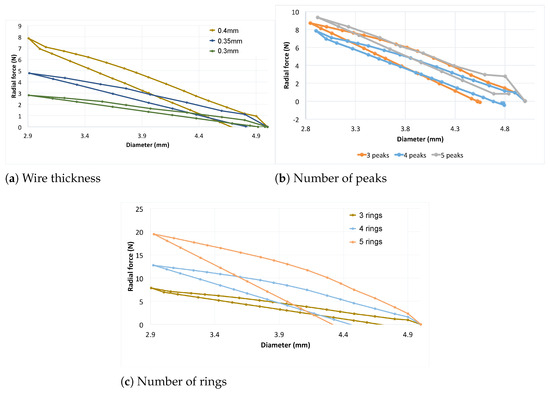 Here, the number of peaks and the wire thickness are maintained constant at four rings and 4 mm, respectively. We have examined configurations with three, four and five rings. The trend followed by the radial strength is clearly depicted in Figure 8c. As the number of rings for the same length increases, the structure of the stent becomes denser, resulting in increased radial force. For the highest number of rings analyzed here, which is five, the yield limit is reached at some point in the stent, leading to radial recoil. The maximum force at minimum diameter decreases from 19.2 N to 12.9 N and 6.7 N, indicating again that if the pitch angle increases (number of rings decreases for W-pattern), the radial force necessary to compress the stent deceases. In this case, the area under the hysteresis cycles of the orange curve is larger than the brown and larger than the blue one.