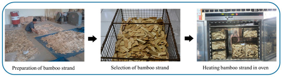 Previous studies have explored different approaches for modifying bamboo strands, intended for producing BOSBs, including steam treatment [11,12,13], a combination of steam treatment with rinse by 1% NaOH [4,7], steam treatment and physical modification [4,14,15], alkaline immersion treatment [16], as well as post-heat treatment [9,17]. Post-heat treatment of BOSBs resulted in enhanced dimensional stability of the composites but decreased their mechanical properties, possibly related to the increased brittleness of the materials after thermal treatment [9,18]. The main benefits of heat treatment include a decrease in weight, improved dimensional stability, superior weather resistance, and improved color stabilization resulting from the chemical transformation and breakdown of the cell wall constituents. The degradation of hemicelluloses during heat treatment enhances dimensional stability by improving the hydrophobic properties due to an increase in lignin concentration.