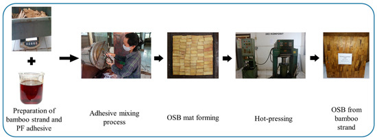Figure 2 depicts the process of manufacturing an OSB utilizing bamboo strands. Laboratory BOSBs with dimensions 300 mm × 300 mm × 9 mm and a target density of 0.7 g cm−3 were manufactured, following the technical procedure described by Maulana et al. [16]. Briefly, approximately 8% of PF resin mixed with 1% paraffin wax were sprayed onto the strands using a rotary blender. The BOSBs were then hot-pressed at a temperature of 135 °C for 9 min under a specific pressure of 2.45 MPa. After the hot pressing, the laboratory-made BOSBs were conditioned for seven days at a temperature of 20 ± 2 °C and a relative humidity of 65%. Each treatment was conducted in three replications to ensure accuracy.
