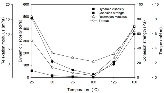 During curing, the relaxation modulus of PF adhesive rose after 150 °C due to crosslinking of polymer chains. Viscosity impacts the torque needed for mixing or dispensing, with higher viscosity requiring greater force. As illustrated in Figure 3, temperature fluctuations influence adhesive viscosity and, consequently, the torque needed for mixing.