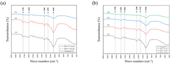 The next step of this research was to evaluate the most effective and efficient pre-heat treatment duration to enhance the properties of the bamboo strand to be used as BOSB. Based on the results of spectra observations made on untreated bamboo strands and bamboo strands with 160 °C heat treatment for 1, 2, and 3 h, the same peaks were found as in Figure 4b, with a decreasing propensity as the heating duration increased. The reduction was found in the peaks with wave numbers 1030 cm−1 and 1728 cm−1, indicating the degradation of hemicellulose functional groups as the heat treatment duration increased. This phenomenon confirms hemicellulose degradation due to heat treatment (Table 3). Heat treatment easily degrades hemicellulose because it has an amorphous structure compared to other structural components [33,34].