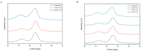 The XRD spectra of the untreated and treated bamboo strands are shown in Figure 5a. All samples showed a typical cellulose XRD pattern with two prominent peaks, namely at 2θ of 18° and 22.5°, attributed to the amorphous and crystalline part of the cellulose, respectively. The crystallinity index (CI) can be calculated to investigate the crystalline structural changes due to the steaming treatment. The CI was defined as the degree of crystallinity calculated using Turley methods; the detailed empirical equation was readily available in previous literature [40,41]. The calculated CI of the untreated sample was found to be 41.5%. It significantly increased to 62.5% and 60.0% when the samples were heat treated at 140 and 160 °C, respectively, for 3 h. A similar result was observed for Figure 5b, with the CI index of the sample increased to 61.5%, 60.5%, and 60.0% after heat treatment at 160 °C for 1, 2, and 3 h, respectively. The pre-heat treatment of the sample increases the crystallinity of the sample. The amount of amorphous region of the sample (i.e., hemicellulose) was partly decreased during steam treatment due to its lower degradation temperatures compared to the other parts (i.e., cellulose and lignin), leading to the increase of CI [42]. Heat treatment of bamboo strand samples for 3 h at 140 °C increased the CI index by almost 1.5 times. This finding is in line with the hemicellulose content of the samples shown in Table 3. However, at higher steam temperature, i.e., 160 °C, increasing the duration of heat treatment led to a smaller increase in the CI index. This was probably due to the start of the crystalline part degradation [40]. Hence, finding the optimum temperature and treatment time was crucial to optimize the crystallinity degree of the heat-treated bamboo strands used for manufacturing BOSBs.