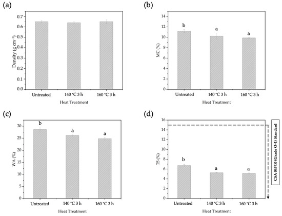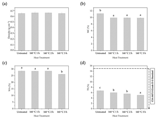 The physical properties of the BOSB after different temperatures of pre-heat treatment are presented in Figure 6. The density of the manufactured BOSBs ranged from 0.64 to 0.65 g cm−3 and can be classified as medium (0.6 to 0.79 g cm−3). The BOSBs manufactured with different heating procedures exhibited similar density values. This suggested that the density of BOSBs is homogenous. The MC values of BOSBs varied from 9.8% to 11.2%. In addition, the WA and TS values of OSBs ranged between 26.13% and 28.60%, and between 5.09% and 6.73%, respectively. All of the BOSB samples met the TS value requirements of the commercial standard CSA 0437.0 for OSBs. The statistical analysis indicated that the pre-heating temperature had a significant impact on MC, WA, and TS values. The DMRT analysis revealed that the MC, WA, and TS values of BOSBs produced from strands heat-treated at 160 °C for 3 h were significantly different compared to other samples. These results suggest that, as happens for wood after pre-heat treatment, particularly at a temperature of 160 °C for 3 h, the sample’s ability to absorb water was significantly decreased.