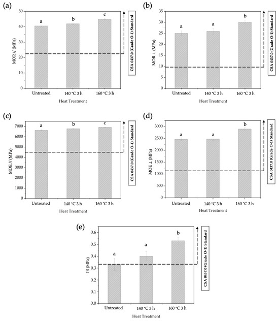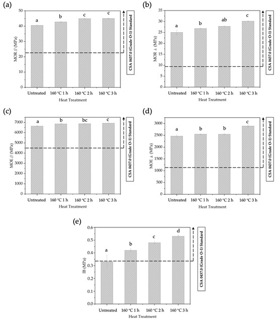 The MOR // (a), MOR ⊥ (b), The MOE // (c), MOE ⊥ (d), and IB (e) of BOSBs fabricated from bamboo strands at different durations of pre-heat treatment. Different letters on the bar chart indicate differences of significance at p < 0.05 as determined by DMRT and ANOVA.