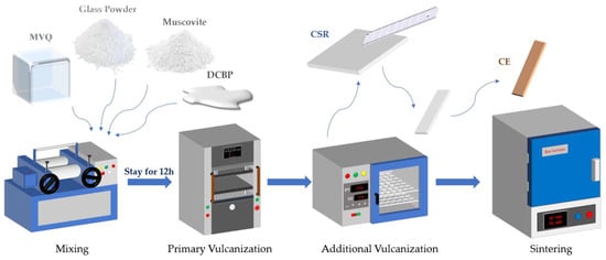 CSR was prepared using a physical mixing method with different mass ratios of wollastonite and muscovite under the vulcanization temperature of 120 °C. Initially, methyl vinyl silicone rubber was placed in an open mill (model XH-401, Dongguan Xihua Machinery Technology Co., Ltd., Dongguan, China) with a gap of 1.5–2.5 mm between rolls. Subsequently, the glass powder, muscovite and DCBP were added sequentially into the silicone rubber. The open mill was running continuously at a speed of 15–20 revolutions per minute for one hour to obtain the composite material. Afterwards, the composite material was placed into a flat vulcanization machine (model CREE-6014A, Dongguan Kerui Instrument Technology Co., Ltd., Dongguan, China) in a stainless steel mold (dimensions: 100 mm × 100 mm × 3 mm) under a pressure of 10 MPa, and then vulcanized at 120 °C for 30 min. Finally, the composite material was transferred to an electric constant-temperature oven (model HZ-2014B, Dongguan Lyxian Instrument Technology Co., Ltd., Dongguan, China) for 5 h at 150 °C for the second vulcanization. The CSR samples with different mass ratios of wollastonite and muscovite were designated as R-40:0, R-30:10, R-20:20, R-10:30, R-0:40, respectively. The detailed formulations of CSR in this study are illustrated in Table 2.
