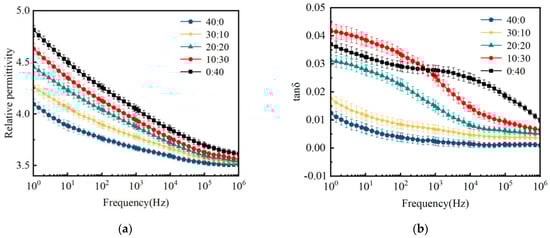 In Figure 9, the volume resistivity of the ceramic samples was calculated according to the volume resistance tested with the megger (model 6517B). It can be found that the volume resistivity of the ceramic samples increased with the increase in muscovite content, indicating a decrease in dc conductivity. As the mass ratio changed from 20:20 to 0:40, there was a sharp increase in volume resistivity. The volume resistivity of the composite dramatically increased from 8.80 × 1010 Ω·cm to 8.69 × 1011 Ω·cm, indicating the presence of a percolation transition around the 20:20 mass ratio [57,58,59]. At this mass ratio, the segregated conductive network in the composite was produced, resulting in a significant increase in volume resistivity. It is believed that the addition of muscovite promotes a dense internal structure with fewer pores and stronger adhesion among components, leading to the obstruction of conductive pathways and high volume resistivity [60,61].
