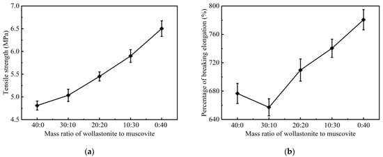 Mechanical properties of CSR with different mass ratios of ceramic inorganic fillers: (a) tensile strength; (b) percentage of breaking elongation.