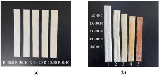 As shown in Figure 6a, the silicone rubber samples were cut into strips with dimensions of 80 mm × 10 mm × 3 mm. Then, the samples were sintered at 950 °C to obtain ceramic bulks as presented in Figure 6b. The ceramic samples maintain the overall shape and contour of the CSR samples. Specifically, the ceramic sample (C-40:0) without doping muscovite has a white color and exhibits an uneven surface with clear warping. However, as the muscovite content increases, the surface warping decreases and becomes smooth. Additionally, the color of the samples gradually changes from the white of sample C-40:0 to the brownish-yellow of sample C-0:40.