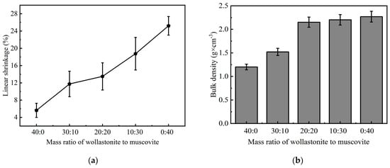 Linear shrinkage and density of ceramic samples with different mass ratios of inorganic fillers, (a) linear shrinkage, and (b) bulk density.