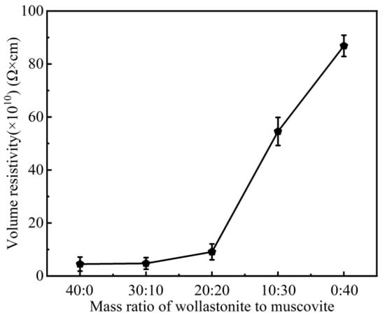 The effects of wollastonite and muscovite on the electrical properties of the silicone rubber are shown in Figure 3. At a ratio of 40:0, the volume resistivity of CSR reaches 9.99 × 1014 Ω·cm. As the amount of muscovite increases, the volume resistivity of CSR gradually decreases to 6.713 × 1014 Ω·cm. Muscovite is composed of SiO2 and a variety of metal oxides (MgO, K2O, Al2O3, CaO) [28,29]. Under the action of an electric field, metal ions are ionized and the concentration of carriers in CSR increases, resulting in a decrease in volume resistivity [30,31]. Meanwhile, doped, layered muscovites are difficult to homogeneously disperse in the silicone rubber matrix, and the agglomerated particles may induce interface defects in CSR, provide an electrical conduction path, and give rise to a decreased volume resistivity [32]. Therefore, as the muscovite content increases, the volume resistivity of CSR is reduced, as shown in Figure 3. However, it still meets the requirement that the volume resistivity of insulating materials is no less than 1.0 × 1011 Ω·cm [33,34,35].