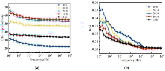 Figure 10 shows the dielectric properties of ceramic samples as a function of frequency. The results indicate that the dielectric constant of the ceramic samples remains relatively stable with increasing frequencies. As the mass ratio of wollastonite to muscovite varied from 40:0 to 10:30, the dielectric constant (at 50 Hz) of the ceramic samples increased from 24.27 to 57.78. However, when the ratio continues to increase to 0:40, the εr of the ceramic sample significantly decreases to 0.01. Moreover, the dielectric loss of the ceramic sample shows a downward trend with increasing muscovite content, especially at low frequencies. According to Equation (9), the decreasing electrical conductivity (the reciprocal of the volume resistivity) of the ceramic samples (as shown in Figure 9) also plays a great role in restraining the dielectric loss at low frequencies, as shown in Figure 10b [64]. Moreover, a small loss peak at low frequencies might be a result of the equivalent alternating current conductivity g, which is related to the impurity ion polarization caused by the doped fillers or glass powder.
