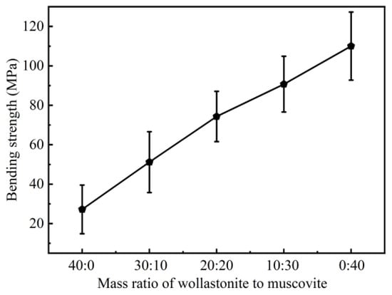 The three-point bending strength of ceramic samples with different mass ratios of inorganic fillers is presented in Figure 11, indicating that the increase in muscovite content improves the three-point bending strength. When muscovite is used as the sole inorganic filler (0:40), the three-point bending strength reaches 110.03 MPa, about five times higher than that when wollastonite is used as the sole inorganic filler (40:0). This value is also notably superior to the range of 14–61 MPa reported in previous studies [26,55,65,66]. In Figure 7, SEM results reveal that the internal structure of the ceramic sample exhibits numerous pores when only wollastonite is used as the inorganic filler, leading to a low mechanical strength. On the other hand, muscovite plays a positive role in reinforcing the mechanical strength of the ceramic samples, as it builds a continuous structure with the aid of fluxing agents and enhanced muscovite adhesion within the matrix [67]. Consequently, the ceramic sample with a 0:40 ratio exhibits a high three-point bending strength.