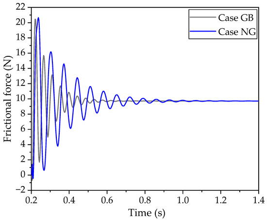 Similarly, as illustrated in Figure 15a, the depression time for the GB case is faster than that for the NG case, which qualitatively implies good agreement with the simulation data. As depicted in Figure 15b, the discrepancy between the experimental results and the simulation for the frictional force of the NG case was 11.3%, quantitatively indicating moderate agreement between the simulation and the experimental data.