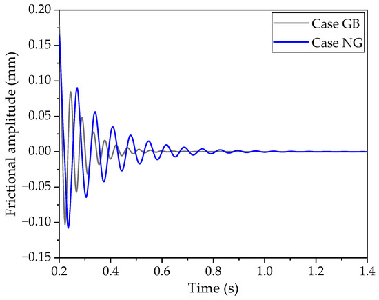 Figure 5 depicts the frictional forces for the GB and NG cases, which represent cases with and without a groove, respectively. It is evident that the frictional force in the GB case is significantly lower than that in the NG case, particularly after the second and subsequent periods. Additionally, the rate at which the amplitude of the frictional force tends to a steady state in the GB case is approximately 0.6 s faster than in the NG case. This indicates that the presence of the groove significantly enhances the damping ability, effectively reducing the frictional force.