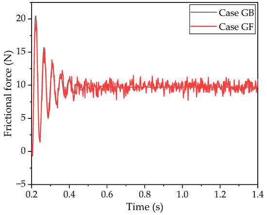 As depicted in Figure 14a, the time taken to reach a steady state is less in the GB case than in the GF case. Additionally, in both simulation and experiments, the vibrations continue in the GF case to a steady state and are depressed in the GB case, qualitatively indicating good agreement. Furthermore, as depicted in Figure 14b,c, the frictional forces measured for the GB and GF cases were 10.6 N and 11.2 N when the vibration was suppressed or in a steady state, respectively. The discrepancies in frictional forces between the experimental results and the FE simulations for the GB and GF cases were 9.3% and 12.1%, respectively, quantitatively implying a moderate agreement between the simulation and the experimental data in both the GB and GF cases.