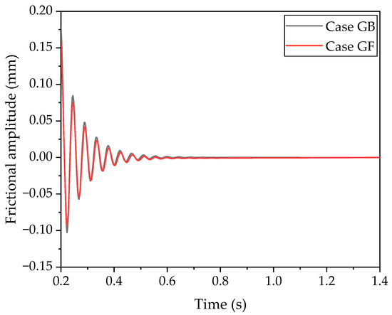 Figure 8 depicts the vibrational amplitudes in the tangential direction for the GB and GF cases. It is evident that the vibration amplitudes decay progressively in both cases. The maximum amplitude is roughly 0.15 mm for both configurations. The frictional amplitudes in both directions are nearly identical, and the attenuation rate in the GB case is very similar. This suggests that the influence of the direction change on vibrational amplitude is not significant.