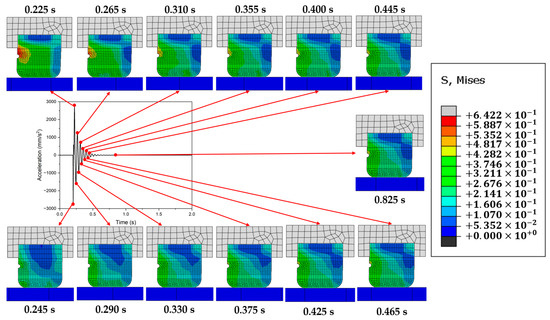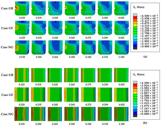 Figure 9 displays the distribution of stress in the block side profile over time for the GB case, with snapshots captured at the time when the maximum and minimum amplitudes appear within each period. It is evident that overall, the stress at the front of the block is less than that at the back. Notably, when the vibrational amplitude reaches its positive maximum, stress concentrations in the rubber are observed around the groove. Conversely, when the amplitude is at its negative maximum, the distribution of stress is more even, reminiscent of the findings presented in Figure 1. The vibration period is approximately 0.044 s in the GB case. Although in both GB and NG cases, the stress around the groove is the highest in the rubber when the vibrational amplitude reaches its positive maximum, the period of the vibration in the GB case is approximately 0.024 s shorter than that in the NG case.