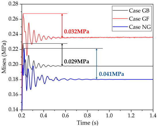 Figure 10 illustrates the stress variation over time. It is evident that in the steady state, the stress is the highest in the GF case, followed by the GB and NG cases. However, the stress in the GB case reaches a steady state first, while the stress in the NG case is the last to stabilize. Similar to the vibrational amplitude in the GF case, the stress in this configuration also exhibits continuous oscillation. The differences between the maximum stress and the steady-state stress are 0.041 MPa, 0.029 MPa, and 0.032 MPa for the NG, GB, and GF cases, respectively. The smallest difference is observed in the GB case, suggesting that the presence of a groove at the back of the rubber block accelerates the decaying of vibrational energy.