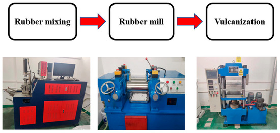 The sample preparation process is detailed in Figure 12. Rubber and additives are thoroughly mixed to create a uniform blend, a crucial step in ensuring that rubber products exhibit consistent performance and quality. The rubber mixing mill is instrumental in blending and plasticizing the raw materials, providing the calendered plastic products with a molten material that is both uniformly mixed and plasticized. The final stage involves vulcanization, where auxiliary materials are added to induce chemical and physical changes in the rubber, enhancing its properties and rendering it suitable for practical use. Rubber vulcanization is a process that requires precise control of pressure, temperature, and time, as these factors must be carefully managed to meet the specific performance requirements of the rubber products. The sample composition and ratios include natural rubber/butadiene rubber (NR/BR) at a ratio of 80/20 parts per hundred rubber (phr), along with 20 parts carbon black, 2 parts stearic acid, 5 parts zinc oxide, and 3 parts sulfur, among other components.