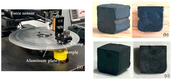 The test rig depicted in Figure 13a comprises several key components, including a beam, a clamping mechanism to secure the rubber block, and a rotary disc made of aluminum. Two force sensors are mounted to measure the frictional force in the x-direction and the vertical force in the y-direction, respectively. The rubber blocks with and without a groove are illustrated in Figure 13b,c, respectively.