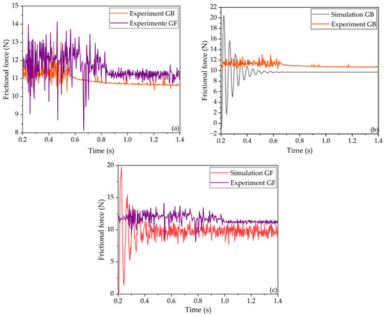 Figure 14. Comparison of the frictional force in the GB and GF cases. (a) Comparison of the experimental data between the GB and GF cases; (b) Data comparison of the GB case between the simulation and the experiment; (c) Data comparison of the GF case between the simulation and the experiment.