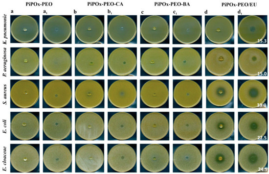 - Kopka, B.; Kost, B.; Rajkowska, K.; Pawlak, A.; Kunicka-Styczynska, A.; Biela, T.; Basko, M. A simple strategy for efficient preparation of networks based on poly(2-isopropenyl-2- oxazoline), poly(ethylene oxide), and selected biologically active compounds: Novel hydrogels with antibacterial properties. Soft Matter 2021, 17, 10683–10695. [Google Scholar] [CrossRef]