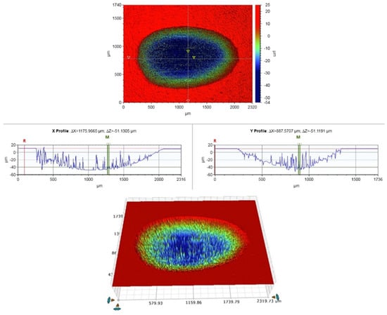 A two-body wear test was performed on disc-shaped (10 mm in diameter and 2 mm in thickness) specimens (n = 5/group). Each specimen was fixed to an acrylic resin block and sequentially polished using silicon carbide sheets with grain sizes up to 4000 grit FEPA. The specimens were stored in water at 37 °C for 24 h before testing. A chewing simulator (CS-4.2, SD Mechatronik, Feldkirchen-Westerham, Germany) with two chambers was used to conduct the wear test in the presence of water. The specimens were fixed to the lower plastic holder of the simulator, while the manufacturer’s standard loading tips (Steatite ball, 6 mm) were secured to the upper one with a fastening screw. A chewing simulation was performed at 1.5 Hz with a vertical weight of 2 kg, which is equivalent to 20 N of chewing force. Each specimen was subjected to 15,000 loading cycles. The wear patterns were then scanned with a 3D optical microscope (Bruker Nano GmbH, Berlin, Germany), and the material loss estimates were calculated using Vision64 Map software (version 1, Bruker Nano GmbH, Berlin, Germany) The total vertical wear depth values were acquired in micrometers (μm) from several sites by averaging the deepest points of all profile scans (Figure 1).