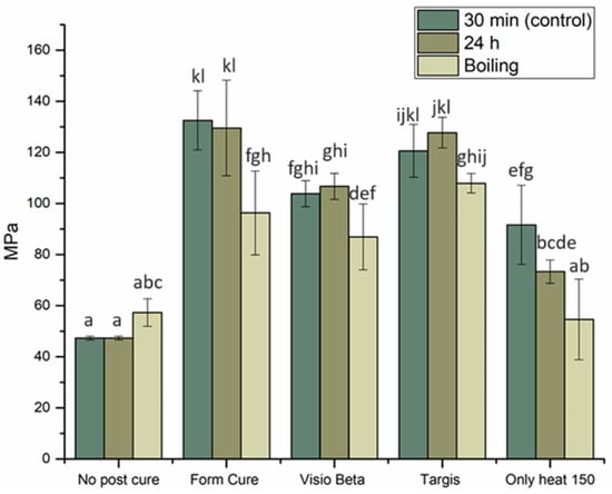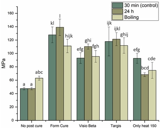 FS with SD of VST specimens tested under different post-curing conditions. Different letters indicate statistical significance.