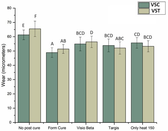 Wear depth in μm and SD of VSC and VST post-cured under different post-curing conditions. Different letters indicate statistical significance.