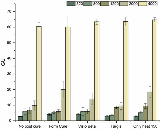 Figure 5 shows the surface gloss measurements acquired from VSC specimens. Overall, employing silicon paper with a grit size of 4000 yielded the highest surface gloss irrespective of the post-curing method used, whereas silicon paper with a grit size of 320 yielded the lowest measurement.