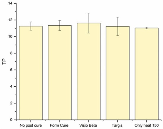 Figure 6 shows the mean values and standard deviations of the translucency parameter (TP) for VSC specimens. Despite using various post-curing conditions, the TP values exhibited minimal variation, remaining largely consistent across the different conditions.