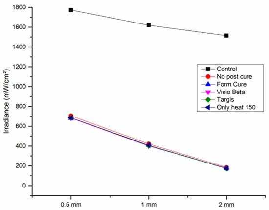 The irradiance values of transmitted light exhibit an inverse relationship with the thickness of the materials, with increasing thickness resulting in decreased light transmission. As illustrated in Figure 7, the quantity of light transmitted through specimens with a thickness of 2 mm was approximately half that of specimens with a thickness of 1 mm across all groups, and the transmission was highest through the 0.5 mm specimens. It is noteworthy that all experimental groups, irrespective of the post-curing condition employed, demonstrated equivalent light transmission values for each respective thickness.