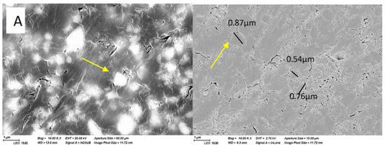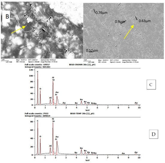 The SEM analysis presented the microstructure of each tested material, with a similar appearance of the surface features (Figure 8). The ceramic particles can be seen (yellow arrows) as small fillers distributed within the resin matrix. The sizes of the ceramic fillers in both materials are observed to be predominantly smaller than one micrometer, as evidenced by the scale bars. This aligns with the manufacturer’s data indicating a filler size of 0.7 µm. EDS analysis indicated comparable levels of Si, Zr, Al, Ba, Sr, and Au in both VSC and VST materials. However, the C and O content was found to be more pronounced in VSC compared to VST (Table 2).