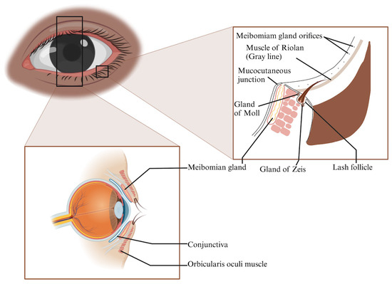 Illustration of marginal eyelid structures and associated glands. The insets show the meibomian gland orifices along the lid margin, Riolan’s muscle, mucocutaneous junction, and accessory glands of Zeis and Moll. Permission to reprint granted by Wu et al. (2024), from the publication titled Polymers and Biomaterials for Posterior Lamella of the Eyelid and the Lacrimal System [68].