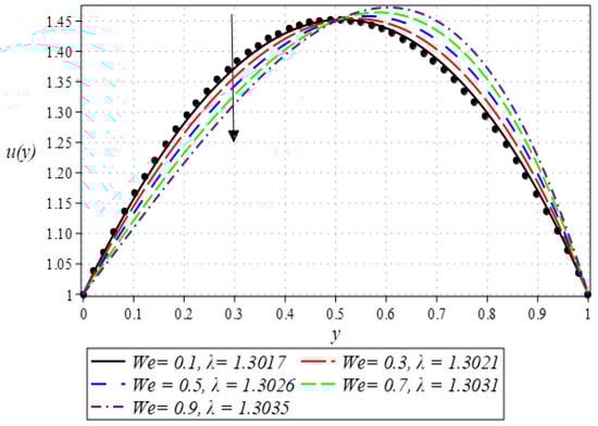 The numerical findings for the volumetric flow rate , the exit sheet thickness , the roll separating force, and the power contribution are displayed in Table 1, Table 2 and Table 3 for different values of the , and . Interestingly, Table 1 demonstrates that as the values of parameter We increase, there is an augmentation in flow rate, coating thickness, the power induced to the material by the rolls, and roll separating force. Similarly, Table 2 exhibits a similar trend of increasing flow rate and coating thickness with increasing values, while the magnitude of roll separating force and power input decreases. From Table 3, it has been observed that as increases from 0.5 to 4.5, there are noticeable changes in these quantities. Interestingly, the power input required to drive the process shows a nonlinear relationship with . At lower values of , the power input is negative, suggesting that the system might be operating in a mode where less external energy is needed. However, as increases beyond 2.5, the power input shifts to positive values and escalates rapidly, reflecting the higher energy required to overcome the increased viscous resistance and maintain the coating process.