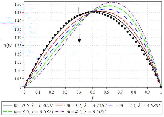 Incorporating Equation (33) into Equation (35) yields a transcendental equation in , which is solved using the Newton–Raphson method. For the zeroth order, the flow rate is calculated as 1.3015, accurate to four decimal places, with a residual error of −0.00046. It is important to note that the coating, as mentioned earlier, thickness is attained precisely at the separation point . Notably, these zero-order results closely resemble those found by Sofou and Mitsoulis [34].