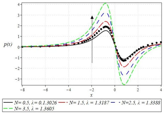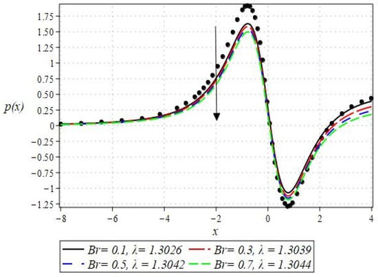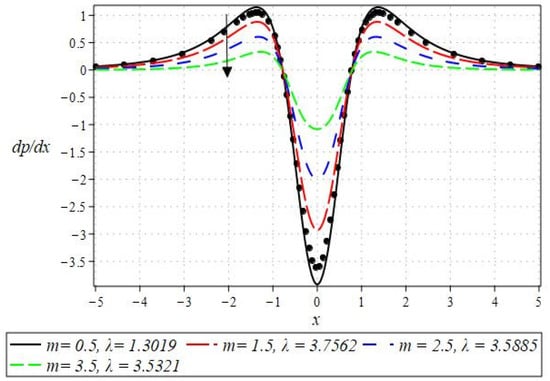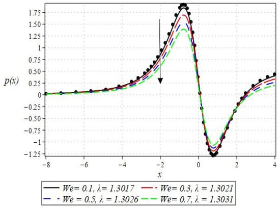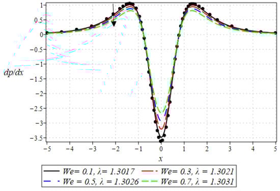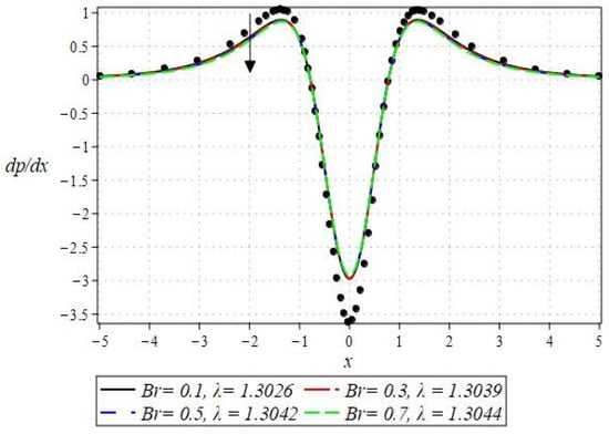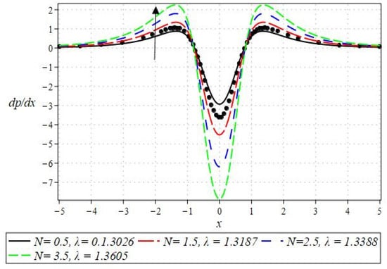 The pressure gradient and pressure profile are critical in the roll-over web coating process because they have a direct influence on fluid dynamics and coating quality. The pressure gradient pushes the coating fluid between the rolls and the substrate, ensuring a consistent and controlled flow, which is critical for achieving uniform coating thickness. An appropriate pressure gradient aids in the uniform distribution of the fluid, preventing defects such as streaks, bubbles, and uneven layers. Furthermore, the pressure gradient and pressure profile play important roles in determining the fluid’s shear stress, which influences its deformation and flow behavior. So, the graphical representation of the pressure gradient (P. G.) is depicted in Figure 6, Figure 7, Figure 8 and Figure 9. It has been observed that the pressure gradient decreases with increasing values of , , and , whereas it increases by increasing the values of . The pressure profile, which depicts how pressure varies along the coating length, is also important because it influences the stability and uniformity of the coating process. A consistent and well-managed pressure profile ensures that the fluid adheres properly to the substrate, forming a continuous, defect-free coating. Therefore, Figure 10, Figure 11, Figure 12 and Figure 13 are drawn to show how the involved parameters affect the pressure profile versus the dimensionless axial coordinate and the Newtonian case. From these figures, it is observed that the pressure profile decreases by increasing the values of , and , whereas increasing by raising the value of . In addition, the pressure begins to increase from zero, and it reaches its highest levels just before the nip. Physically, it seems true because maximum pressure is required just before the nip to pass the fluid through the channel (nip).