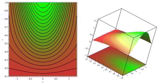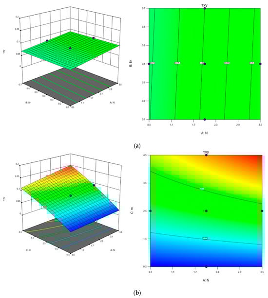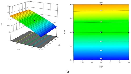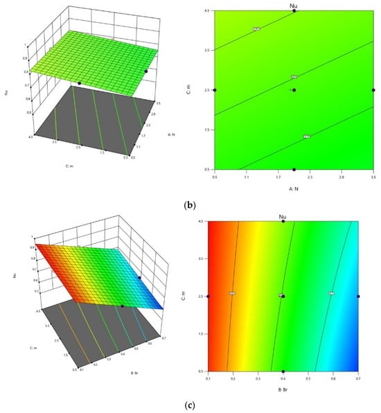 The effect of parameters , , and on and were investigated using surface plots and contour plots in Figure 16 and Figure 17 for Equations (54) and (55). The interconnection among and was analyzed by maintaining the third parameter as constant. It can be observed from Figure 16a that decreases for the lower values of and higher values of . The impact of and on can be visualized in Figure 16b, i.e., for lower values of and , decreases, by keeping as fixed. Similarly, from Figure 16c it is evident that as values diminish, and values rise, one can observe the minimum value of .
