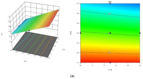 Investigating the impact of shear stress rate () and heat transfer rate () sensitivity involves employing a quadratic model with coded coefficients, as expressed in Equations (54) and (55). The derivation of sensitivity functions is accomplished by taking partial derivatives of the sensitivity functions are determined by taking partial derivatives of the quadratic model with respect to the coded variables, giving rise to the expression of the following equations.