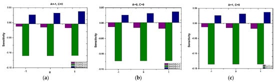 Similarly, Figure 19a–c delineate the sensitivity of across various chosen variables. Notably, across all levels and as spans from to , shows negative sensitivity to and and positive sensitivity to .