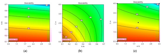 (a–c): Optimized and solution with desirability factors.