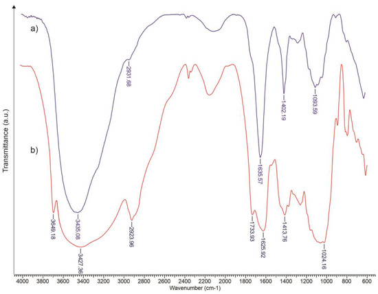 The amplification of the signal at 1402 cm−1 and the weakening of the signal at 1253 cm−1 in the FTIR spectrum of xanthan (Figure 1a) are attributed to the asymmetric stretching of the carboxylate and the deformation of the C=O group, respectively.