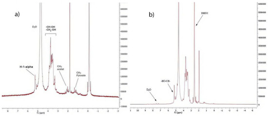 The 1H-NMR spectra for the unmodified and modified xanthan are shown in Figure 2. The peaks at 1.2 and 2.09 ppm are assigned to the methyl group of pyruvate and the methyl group of acetate, respectively. The protons of alcoholic (–CH–OH) and (–CH2–OH) are visible via the signals at 3.0–4.0 ppm. The equatorial anomeric proton, H-1-alpha of mannopyranosic unit C, can be observed at 5.2 ppm [59]. The 1H–NMR spectrum (Figure 2b) proved the chemical modification of xanthan via esterification with oleic acid. The chemical shift at 5.3 ppm in the XaAO spectra was ascribed to olefinic protons (–HC=CH–) [60].