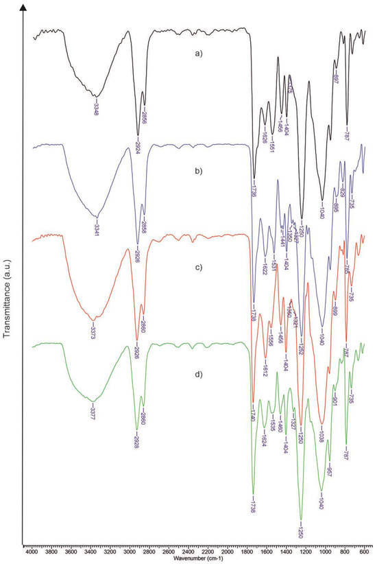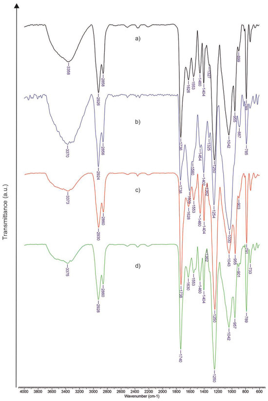 FTIR spectra for materials containing xanthan esterified with oleic acid: (a) XnOA-PU; (b) XnOA-PU-P; (c) XnOA-PU-K; (d) XnOA-PU-P/K.