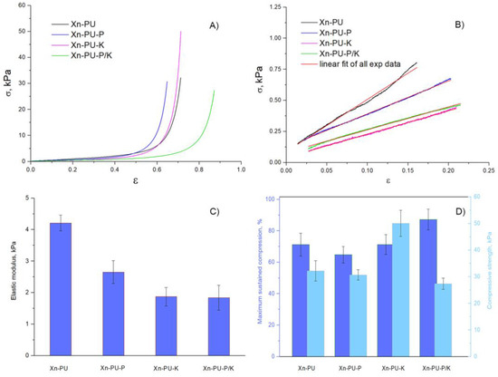 Mechanical properties of swollen Xn-PU-based formulations under compression: (A) Stress–strain profiles of Xn-PU-based formulations; (B) linear dependence of stress–strain curves; (C) elastic modulus calculated according to the standard procedure; (D) maximum sustained compression (dark blue color) and compressive strength (light blue color). The standard deviation is presented as error bars.