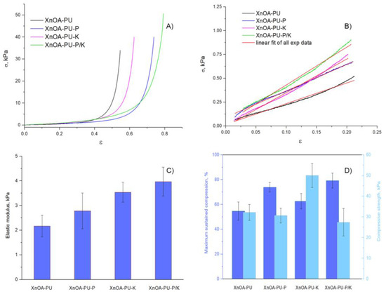 Mechanical properties of swollen XnOA-PU-based formulations under compression: (A) Stress–strain profiles of XnOA-PU-based formulations; (B) linear dependence of stress–strain curves (C) elastic modulus (dark blue color) calculated according to the standard procedure; (D) maximum sustained compression (dark blue color) and compressive strength (light blue color). The standard deviation is presented as error bars.
