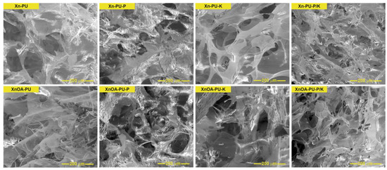 Following the modification of xanthan with oleic acid, there was a notable increase in the elastic modulus values for the formulations loaded with bioactive compounds (Figure 6C). Supporting this observation, the SEM micrographs of the modified samples exhibited denser and thicker walls in the XnOA-PU-P, XnOA-PU-K, and XnOA-PU-P/K formulations, as opposed to the XnOA-PU sponges, as illustrated in Figure 7 and detailed in Table 3.