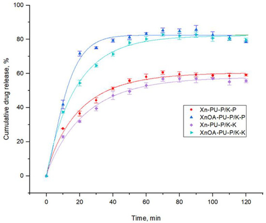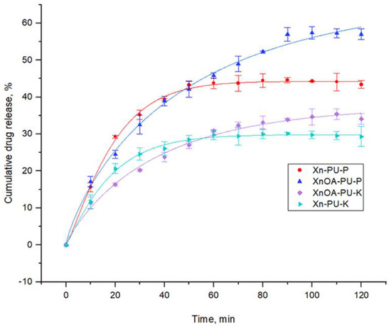 Ketoconazole also possesses anti-inflammatory properties [70], contributing to the higher inhibition value observed in Xn/XnOA-PU-P/K compared to Xn/XnOA-PU-P. Piroxicam’s slightly hydrophilic nature (LogP = 3.06) and its larger polar surface area (as detailed in Table 1) facilitate its release from the slightly hydrophobic polymer matrix that includes modified xanthan. This is corroborated by the data presented in Figure 8 and Figure 9, which show that a greater quantity of piroxicam is released per unit time from XnOA-PU-P (64%) compared to Xn-PU-P (44%). This indicates a more marked anti-inflammatory effect in the former system (82.8% inhibition), as opposed to the latter (71% inhibition).